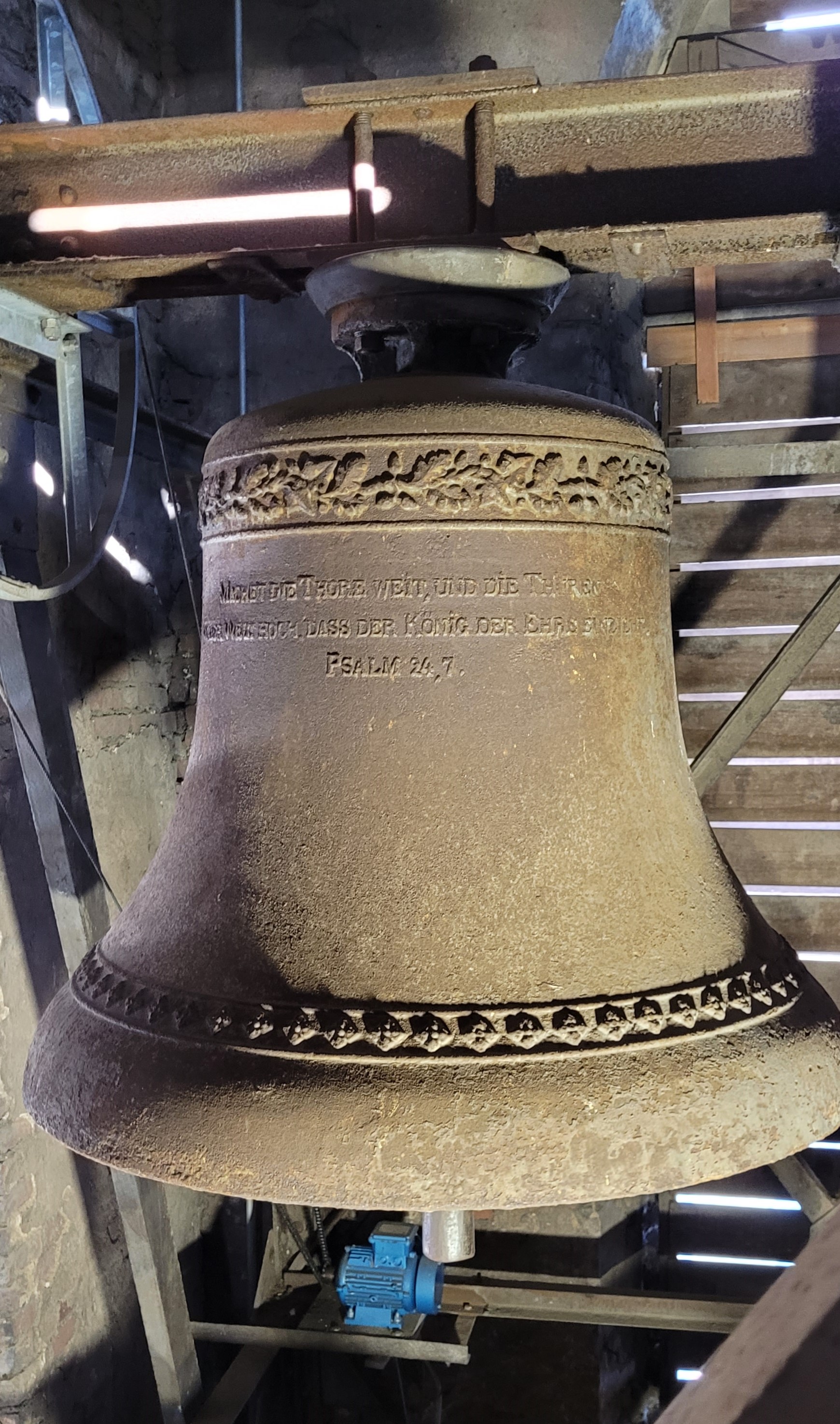 Warum Gemeindeglocke? Die große Glocke ist Sonntags-, Fest- und Totenglocke zugleich. Sie hat seit 1899 jede Konfirmation bejubelt, den Tod unzähliger Gemeindeglieder verkündet und vermutlich zu jedem Sonntagsgottesdienst geläutet. Wenn wir die Hauptinschrift mit dem ersten der 10 Gebote verknüpfen, wird Gemeindeauftrag auch heute deutlich: Gott durch Gottesdienst und Gebet die Ehre zu geben und durch Nächstenliebe Frieden zu stiften. Wo die Liebe ist, da ist Friede!