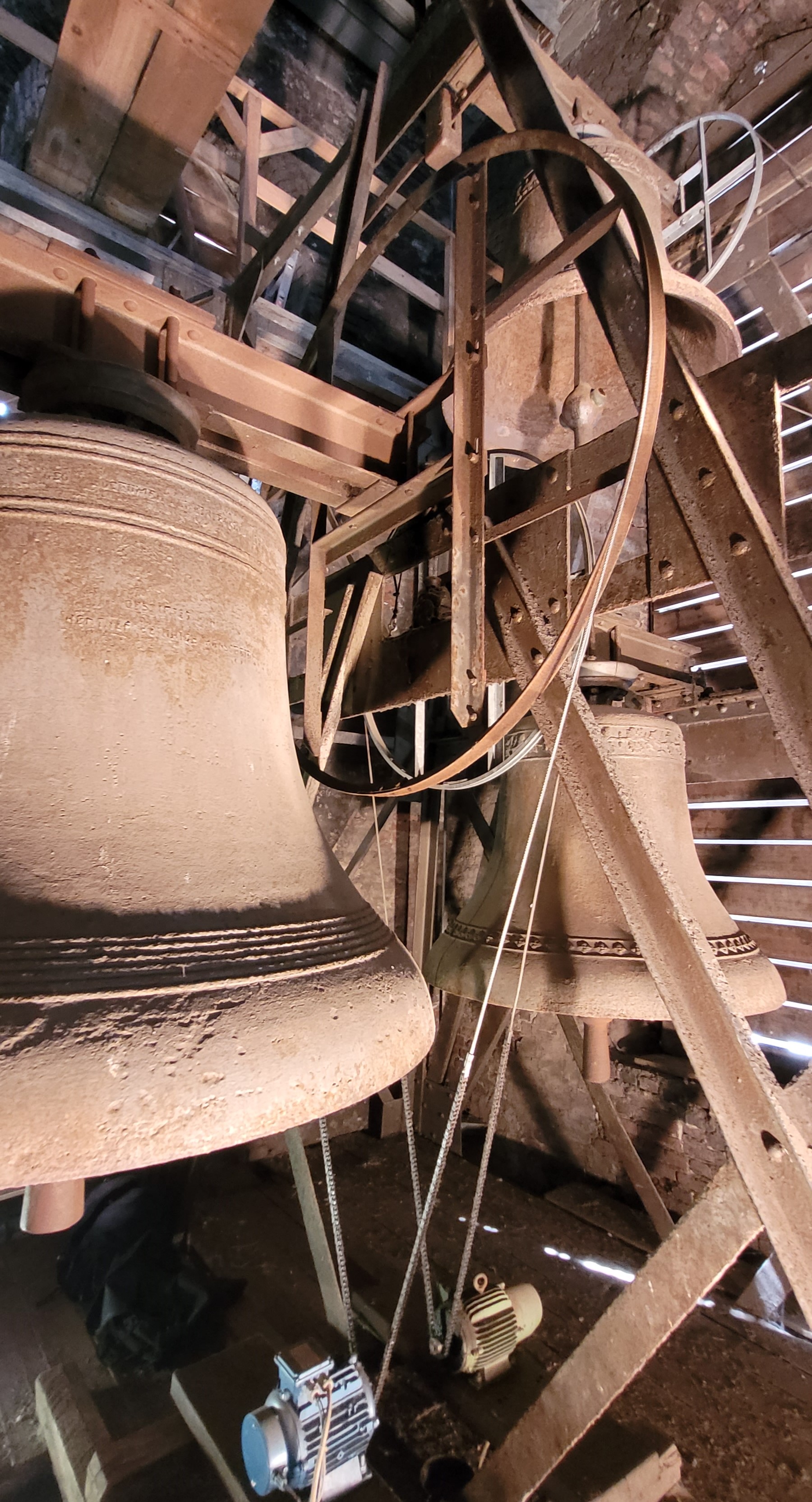 Pfarrer Niederstein und das Presbyterium bemühten sich bereits in der Bauphase der Kirche ab 1898 um ein Geläut. Der erste der drei erhaltenen Kostenvoranschläge des Bochumer Vereins datiert vom 8. Dezember 1898. Bei den späteren Vorschlägen aus 1899 drehte es sich immer um eine offensichtlich zur Verfügung stehende Summe von etwa 6000 Mark. Im Schriftverkehr zwischen dem Bochumer Verein und der Gemeinde taucht in einem Schreiben vom 4. März 1899 zum ersten Mal der Begriff „Lagerware“ auf. Und ja – das Presbyterium hatte sich für zwei auf Lager befindliche Glocken, heute die beiden kleinen Glocken im Turm, entschieden. Zu diesen sollte die große Glocke hinzugegossen werden. Der Zuguss gelang, die Glocken wurden vermutlich im Mai/Juni 1899 geliefert und sind sicher bereits zur Einweihung der Kirche am 4. September 1899 erklungen.